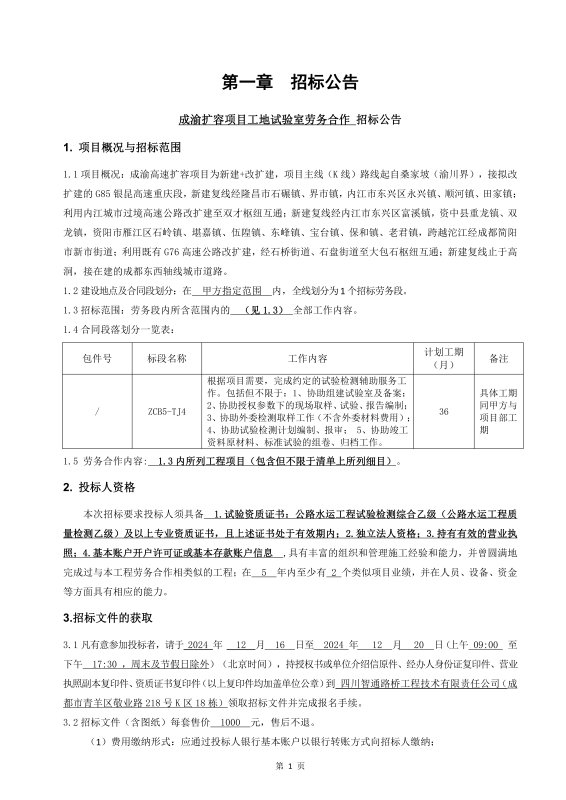 成渝擴容項目工地試驗室勞務合作招標公告